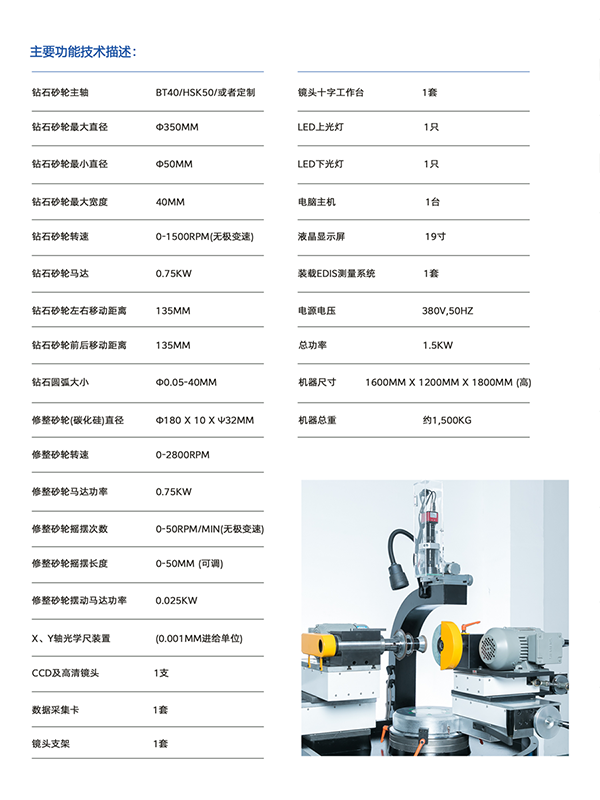 機(jī)床主軸砂輪作為被修整的金剛石砂輪或CBN砂輪,附件上所安裝的砂輪作為修整砂輪即綠色碳化硅砂輪;被修整砂輪二個方向可以調(diào)整,即X軸、Y軸;修整砂輪有三個方向可以調(diào)整,即旋轉(zhuǎn)A軸、X1軸和Y1軸,并且可以變頻調(diào)速的往復(fù)擺動,除此之外,X1軸和Y1軸之間可以旋轉(zhuǎn)和定位,可以實現(xiàn)修整砂輪做180°旋轉(zhuǎn);機(jī)床配有CCD光學(xué)測量系統(tǒng)、光柵尺數(shù)顯測量系統(tǒng)、10到100倍之放大系統(tǒng)、液晶顯示器。